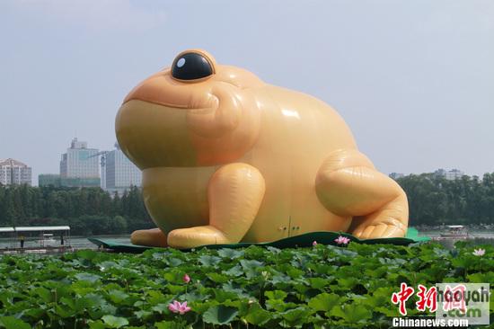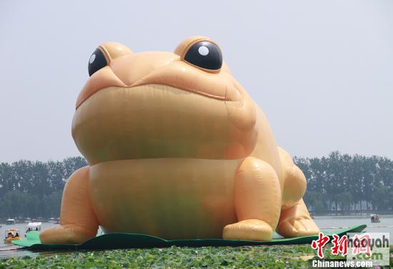 今日上午,记者刚进入玉渊潭园区,便看到湖中漂浮着一只巨大的充气“金蟾”。该金蟾身体肥硕,呈现金黄色,眼睛黑色浑圆,模样讨喜,引来不少游人在湖边驻足拍照。据介绍,该“荷叶大金蟾”高22米,底部长34米,以一只高1米、红木贴金的“大金蟾”为原型,用550个特制涂层裁片制作而成,由宁波市工艺美术大师郭永尧先生设计。
