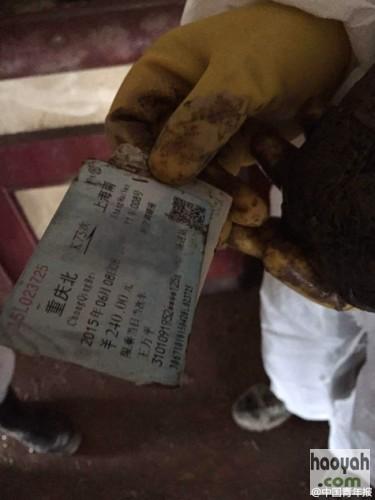 6月8日,湖北省军区某舟桥旅副政委薛政在“东方之星”船舱清理遗物时找到一张火车票,这是一张今天上午重庆北开往上海的火车票。摄影:刘世昕