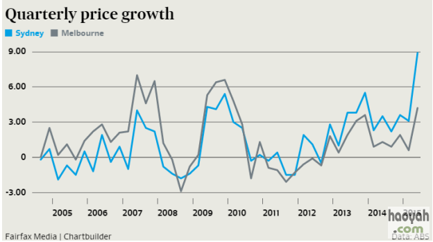 该银行也警告称澳大利亚两大主要城市住宅房产需求减弱可能导致住房供应过剩,尤其是公寓。悉尼拍卖清盘率从4月份的90%多下降到9月份的75%,显示出购房者对房市价格的信心开始下降。就全国来说拍卖清盘率已经从4月份的80%多下降到了现在的70%多一点。同时从2014年8月起就占房贷总额一半多的投资者需求也受到收紧的贷款政策抑制,投资者贷款增长从4月份的29.6%下降到了7月份的16.5%。
