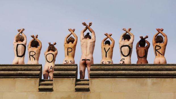 他们登上墨尔本大学标志性的Old Quad大楼楼顶,背对着大楼外围,脱去衣服,后背和屁股上写着“drop your assets”的标语。
