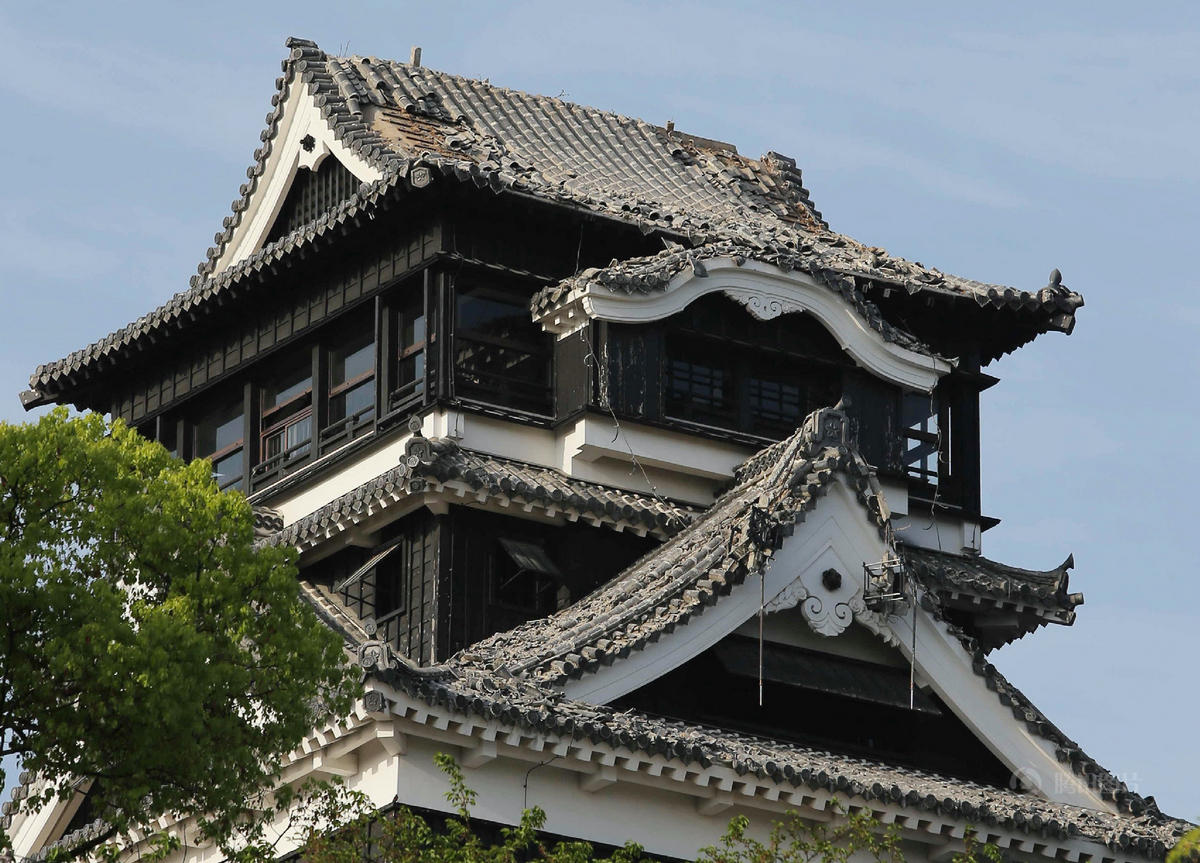 熊本城主体建筑天守阁主体建筑保存完好,部分瓦片掉落。
