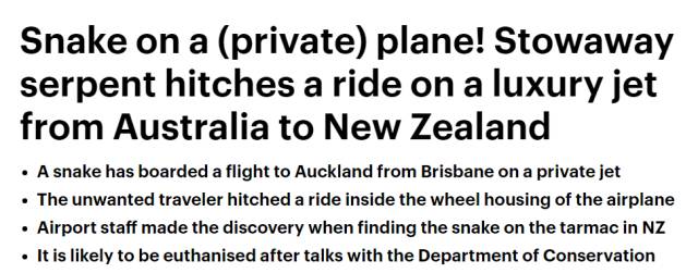 根据每日邮报报道,在一架从布里斯班飞往奥克兰的豪华私人飞机中,一条蛇也正享受着它的旅程。