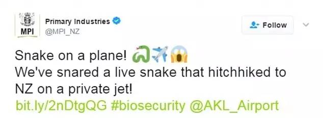 说时迟那时快,就当它爬行在停机坪上的时候,奥克兰当地地勤人员发现了它!这时候大家都是懵逼的,赶快叫了捕蛇人员把这条偷渡的蛇给抓了起来!