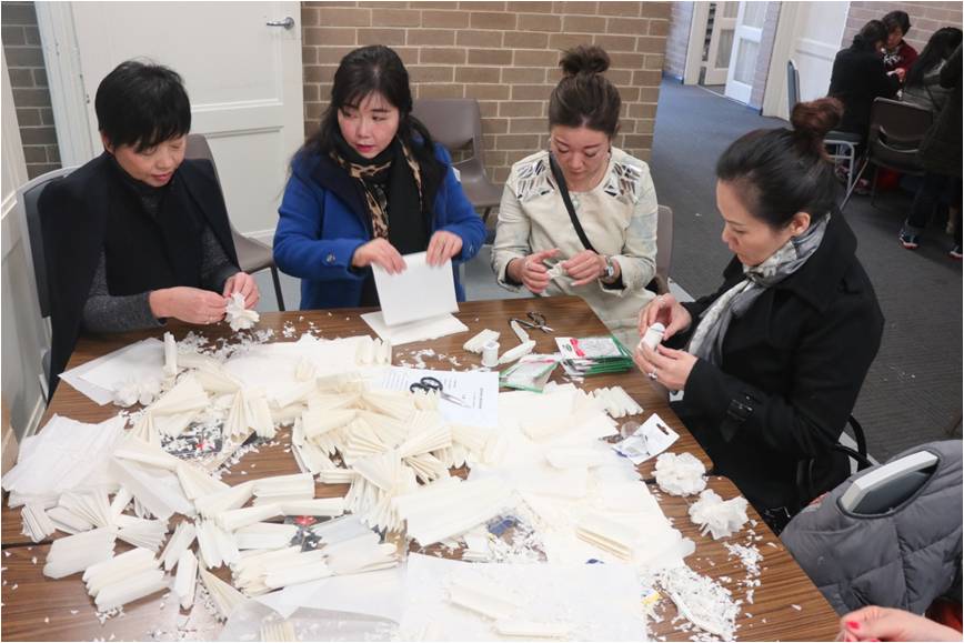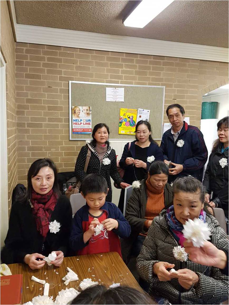 6月11日的中午12点,忙碌在Mount Waverley青年中心开始。十来位女同胞们正在细心地折纸,操剪,绑线为前来参加郝凯追思会的人士精心准备佩戴的小白花。有好几个还是第一次学习做花不过学得非常认真投入,不一会儿女士们就能够分出三道流水作业程序,各守其责,在近三个小时中逾百朵小花成功的呈现在人们的眼前。在妈妈们的表率下,小孩子们也伸出了充满爱心的小手和母亲一起用他们的小小指头翻起一片片花瓣,让小花显得那么的饱满,承着童心,载着人与人之间的淳朴。