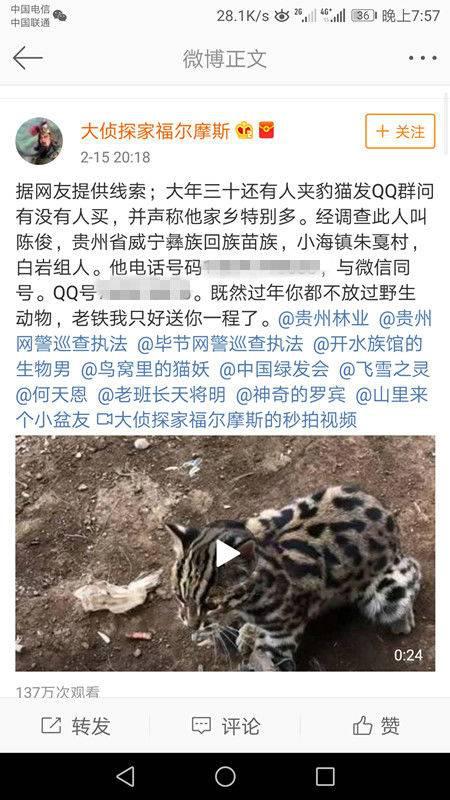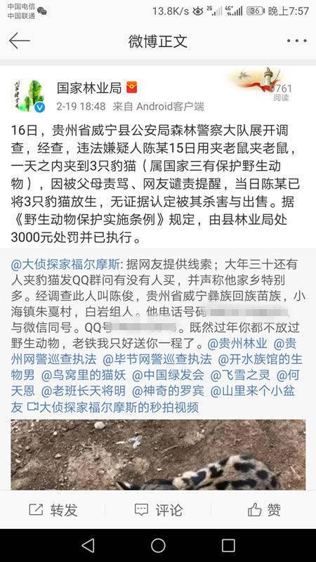 2月15日,网友@大侦探家福尔摩斯 在微博上向国家林业局等单位举报:“有人夹豹猫发QQ群问有没有人买,并声称他家乡特别多。”19日晚,国家林业局就此事回应称,在网上叫卖豹猫者已于大年初一被查获并处3000元罚款。