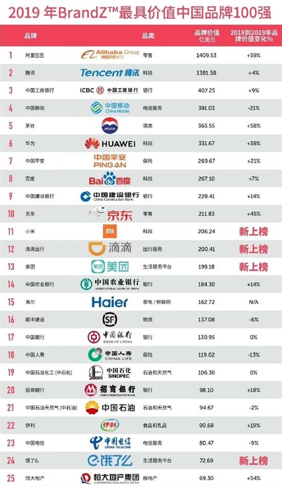 榜单显示,阿里巴巴登顶榜首,成为中国最具价值品牌。其品牌价值同比增长59%,达到1410亿美元。腾讯排名第二,品牌价值1381亿美元,同比增长4%。
