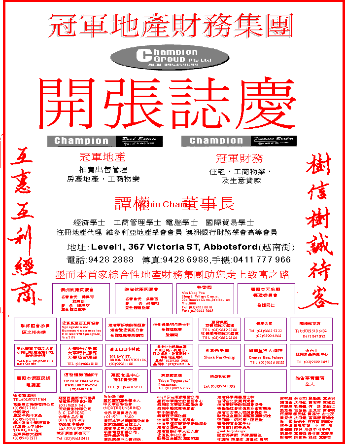 商业目录 Champion Group Pty Ltd 英文名称: Champion Group Pty Ltd中文名称: 冠軍地產財務集團业务分类: 房屋地产详细介绍: 詳情請見廣告联系电话: 9428 2888商务传真: 9428 6988商务地址: 367 VIC Australia toria ST, Abbotsford, VIC Australia 发送消息给业主 商家名称:Champion Group Pty Ltd 您的姓名 您的邮件 消息内容