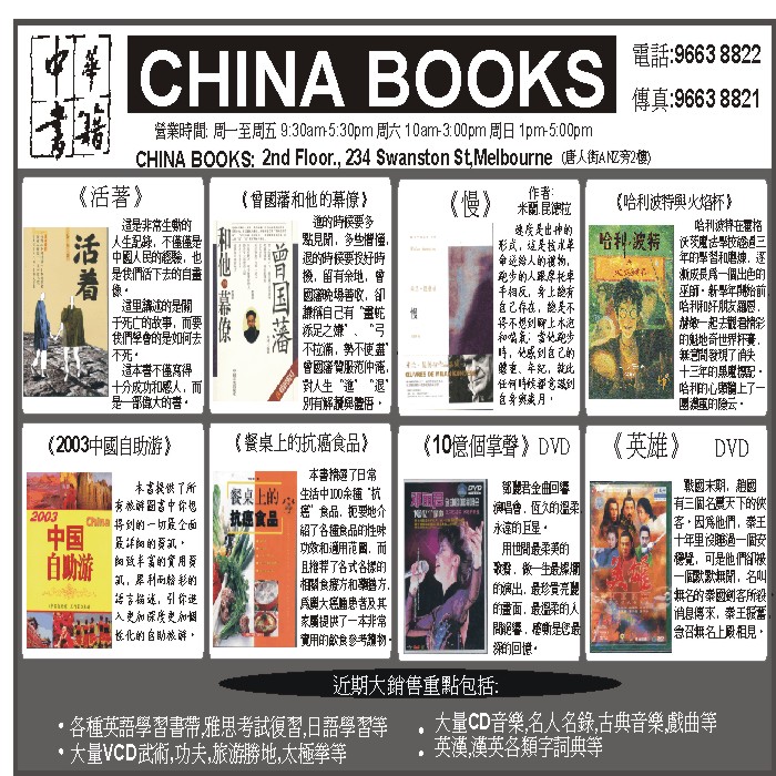 商业目录 China Books 英文名称: China Books中文名称: 中華書籍业务分类: 中级教育详细介绍: 詳情請見廣告联系电话: 9663 8822商务传真: 9663 8821商务地址: 2nd Fl., 234 Swanston St, Melbourne, VIC Australia 3000 发送消息给业主 商家名称:China Books 您的姓名 您的邮件 消息内容