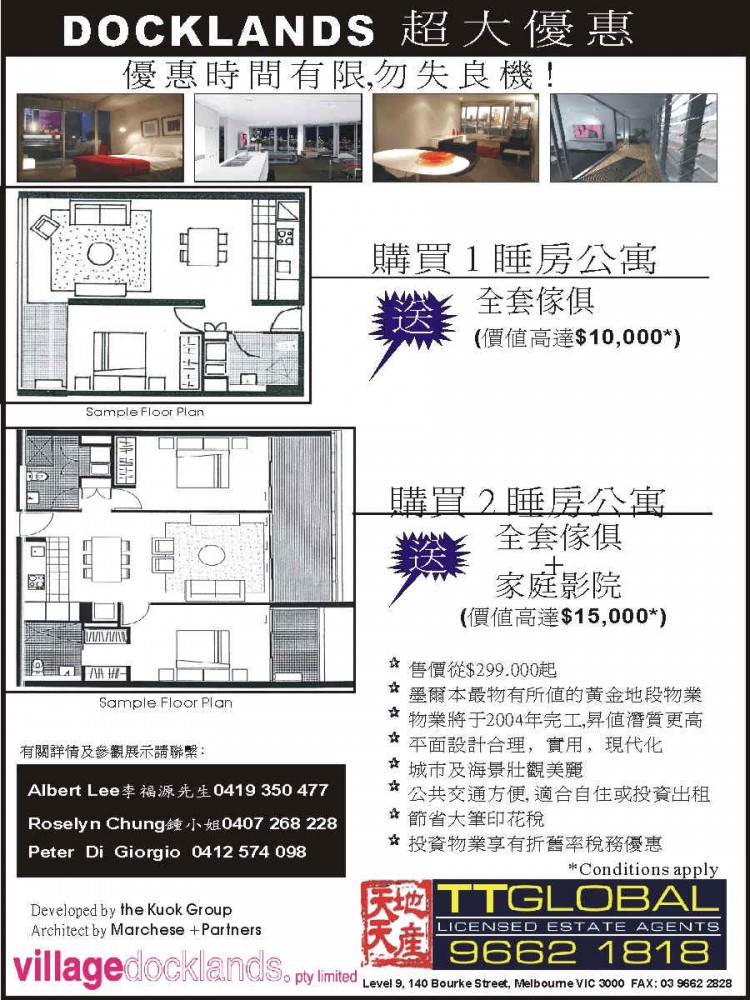 商业目录 TTGlobal Pty Ltd 英文名称: TTGlobal Pty Ltd中文名称: 天天地產业务分类: 房屋地产详细介绍: 詳情請見廣告联系电话: 9662 1818商务传真: 9662 2828商务地址: Level 9, 140 Bourke St, Melbourne, VIC Australia 3000 发送消息给业主 商家名称:TTGlobal Pty Ltd 您的姓名 您的邮件 消息内容
