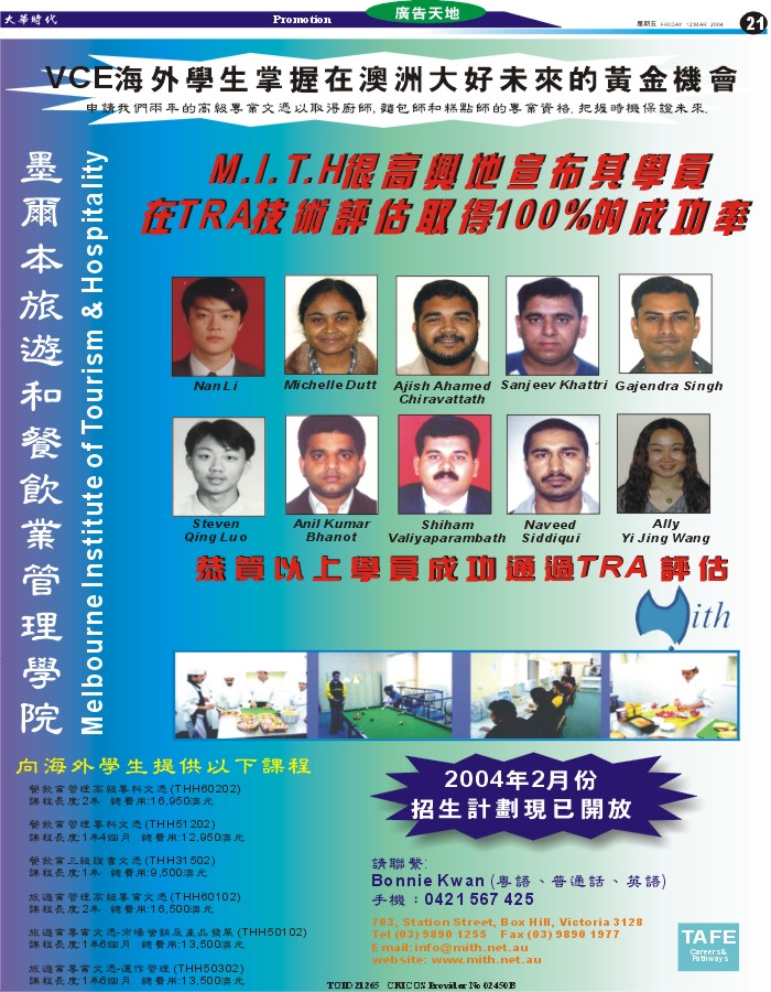 商业目录 Melbourne Institute of Tourism and Hospitality 英文名称: Melbourne Institute of Tourism and Hospitality中文名称: 墨爾本旅游和酒店管理學院业务分类: 中级教育详细介绍: 詳情請見廣告联系电话: 9890 1255商务传真: 9890 1977商务地址: 703 Station St, Box Hill, VIC Australia 3128 发送消息给业主 商家名称:Melbourne Institute of Tourism and Hospitality 您的姓名 您的邮件 消息内容