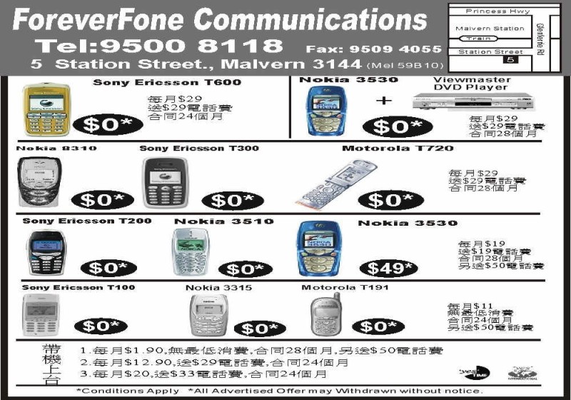 商业目录 ForeverFone Communication 英文名称: ForeverFone Communication业务分类: 电脑通讯详细介绍: 詳情請見廣告联系电话: 95008118商务传真: 95094055商务地址: 5 Station St., Malvern, VIC Australia 3144 发送消息给业主 商家名称:ForeverFone Communication 您的姓名 您的邮件 消息内容