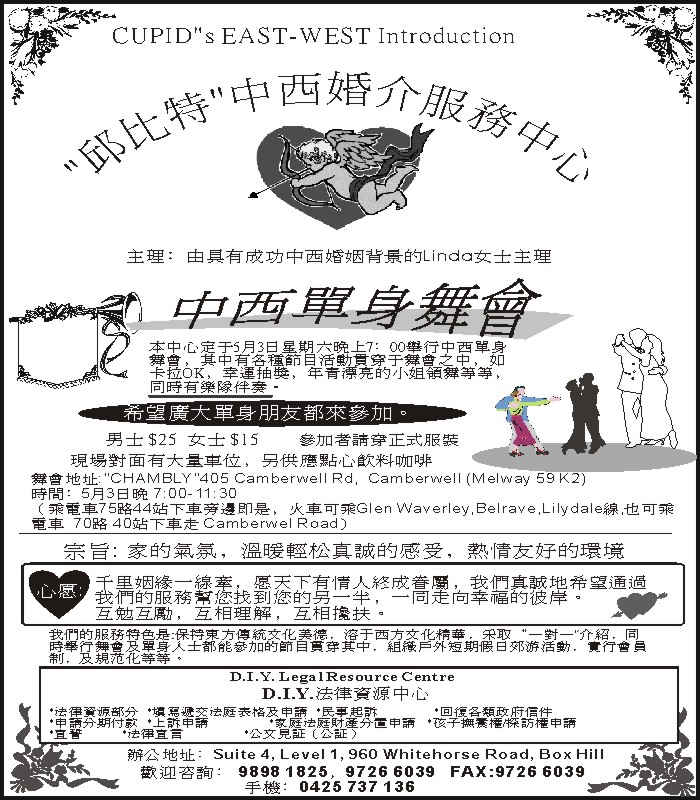 商业目录 Cupid & East-West Introduction 英文名称: Cupid & East-West Introduction中文名称: 邱比特中西婚介服務中心业务分类: 婚介婚庆详细介绍: 詳情請見廣告联系电话: 98981825/97266039商务传真: 97266039商务地址: Suite4, Level 1, 960 Whitehorse road, Box Hill, VIC Australia 发送消息给业主 商家名称:Cupid & East-West Introduction 您的姓名 您的邮件 消息内容