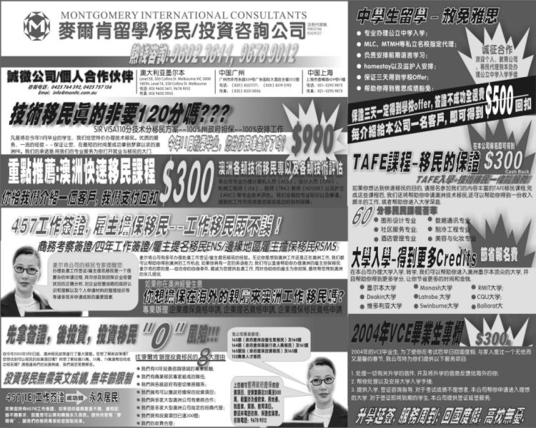 商业目录 Montgomery International Consultants 英文名称: Montgomery International Consultants中文名称: 麥爾肯留學咨詢公司业务分类: 法律移民详细介绍: 詳情請見廣告联系电话: 9678 9012商务传真: 9678 9009商务地址: level 28,303 Collins St., Melbourne, VIC Australia 发送消息给业主 商家名称:Montgomery International Consultants 您的姓名 您的邮件 消息内容
