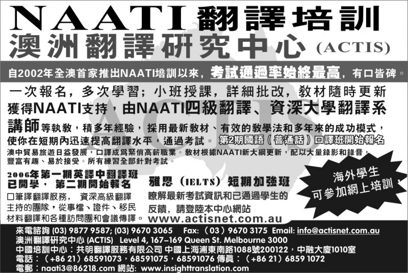 商业目录 ACTIS 英文名称: ACTIS中文名称: 澳洲翻譯研究中心业务分类: 中级教育详细介绍: 詳情請見廣告联系电话: 03 96703065商务传真: 03 9670 3175商务地址: level4, 167-169 Queen St, Melbourne, VIC Australia 3000 发送消息给业主 商家名称:ACTIS 您的姓名 您的邮件 消息内容