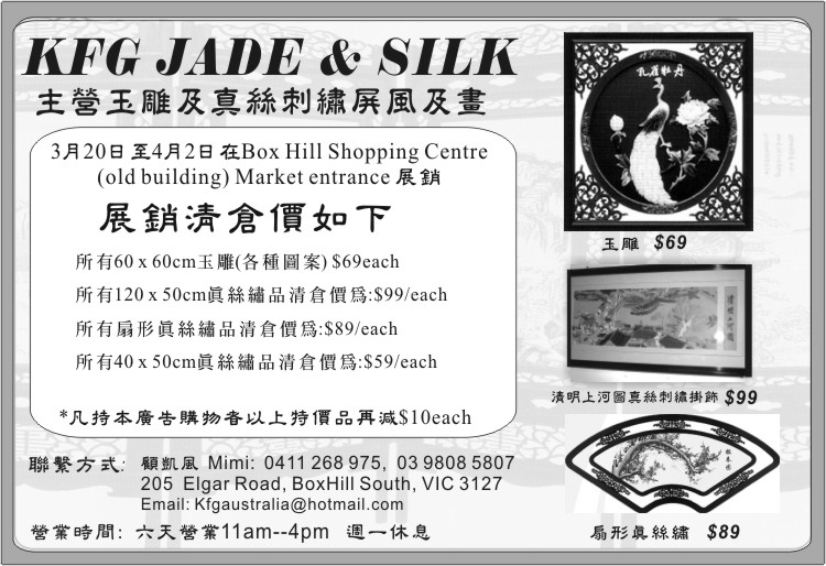 商业目录 KFG Jade&Silk 英文名称: KFG Jade&Silk中文名称: KFG Jade&Silk业务分类: 家具陈设详细介绍: 詳情請見廣告联系电话: 03 9808 5807商务地址: 205 Elgar Road,, Box Hill South, VIC Australia 3127 发送消息给业主 商家名称:KFG Jade&Silk 您的姓名 您的邮件 消息内容