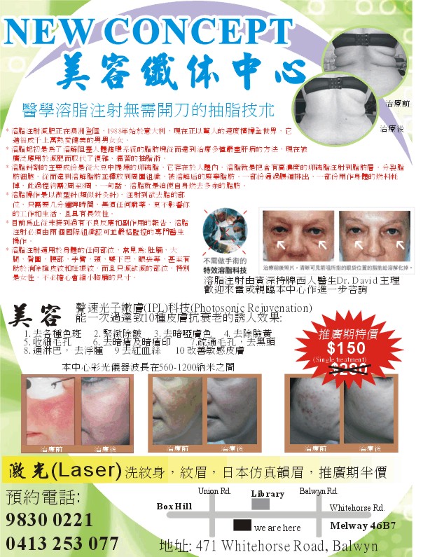 商业目录 New Concept 英文名称: New Concept中文名称: 美容纖体中心业务分类: 医疗保健详细介绍: 詳情請見廣告联系电话: 61 3 9830 0221 or 0413 253 077商务地址: 471 Whitehorse Road, Balwyn, VIC Australia 发送消息给业主 商家名称:New Concept 您的姓名 您的邮件 消息内容