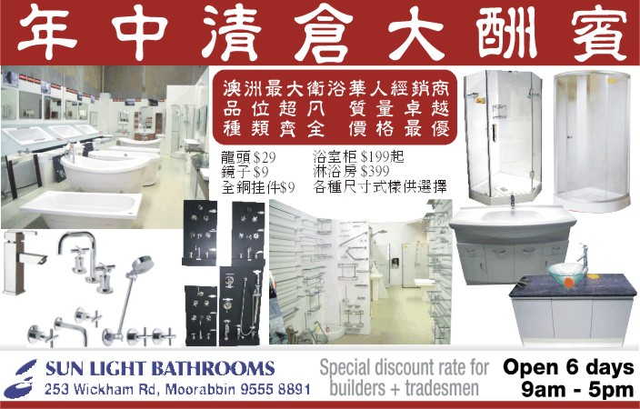 商业目录 SUN LIGHT BATHROOM 英文名称: SUN LIGHT BATHROOM业务分类: 家具陈设详细介绍: 詳情請見廣告联系电话: 61 3 9555 8891商务地址: 253 Wickham Road, Moorabbin, VIC Australia 3000 发送消息给业主 商家名称:SUN LIGHT BATHROOM 您的姓名 您的邮件 消息内容