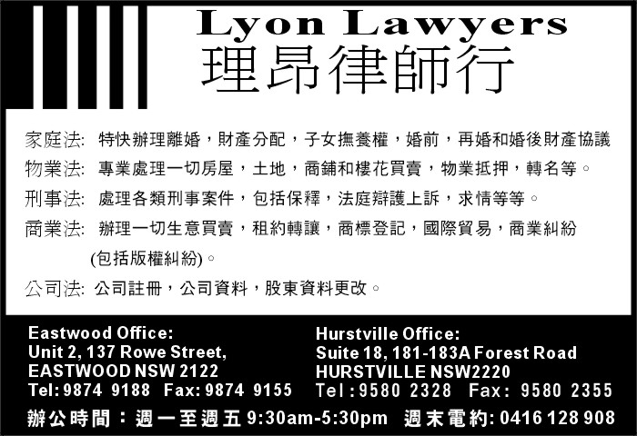 商业目录 Lyon Lawyers 英文名称: Lyon Lawyers中文名称: 理昂律師行业务分类: 法律移民详细介绍: 詳情請見廣告联系电话: 9874 9188商务传真: 9874 9155商务地址: unit2, 137 Rowe Street,, eastwood, NSW Australia 2122 发送消息给业主 商家名称:Lyon Lawyers 您的姓名 您的邮件 消息内容