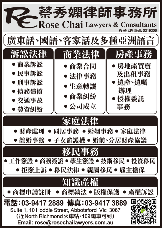商业目录 Rose Chai Lawyers & Consultants 英文名称: Rose Chai Lawyers & Consultants中文名称: 蔡秀嫻律師事務所业务分类: 法律移民详细介绍: 詳情請見廣告联系电话: 03 9417 2889商业标签: Rose, Rose Chai, 律師 发送消息给业主 商家名称:Rose Chai Lawyers & Consultants 您的姓名 您的邮件 消息内容