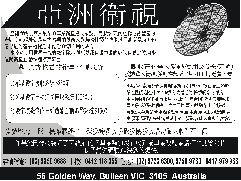 商业目录 Asian TV 英文名称: Asian TV中文名称: 亞洲衛視业务分类: 音响视频详细介绍: 詳情請見廣告联系电话: 98519688, 0412118355商务地址: 56 Golden Way, Bulleen, VIC Australia 3105 发送消息给业主 商家名称:Asian TV 您的姓名 您的邮件 消息内容
