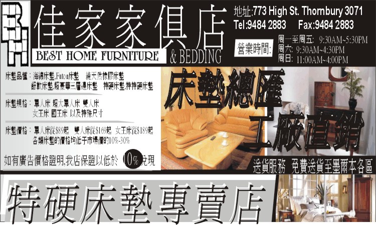 商业目录 Best Home Furniture & Bedding 英文名称: Best Home Furniture & Bedding中文名称: 佳家家具店业务分类: 家具陈设详细介绍: 詳情請見廣告联系电话: 61 3 94842883商务传真: 61 3 94842883商务地址: 773 High St., Thornbury, VIC Australia 3071 发送消息给业主 商家名称:Best Home Furniture & Bedding 您的姓名 您的邮件 消息内容