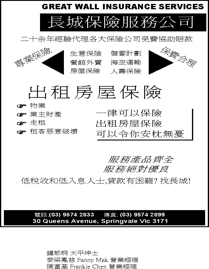 商业目录 Great Wall Insurance Service 英文名称: Great Wall Insurance Service中文名称: 長城保險服務公司业务分类: 金融保险详细介绍: 詳情請見廣告联系电话: 9574 2833商务传真: 9574 2899商务地址: 30 QueensAve, Springvale, VIC Australia 3171 发送消息给业主 商家名称:Great Wall Insurance Service 您的姓名 您的邮件 消息内容