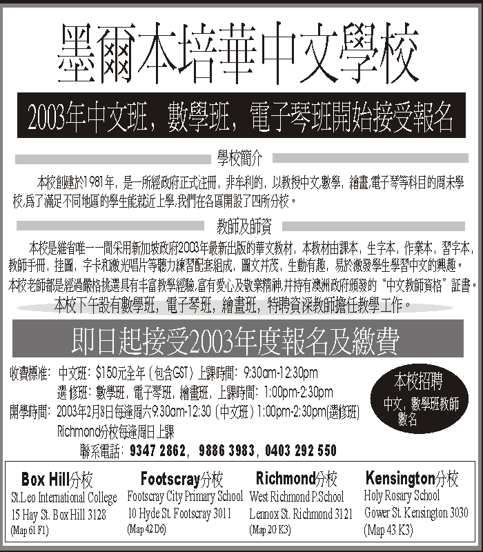 商业目录 Pei Hua Chinese School 英文名称: Pei Hua Chinese School中文名称: 墨爾本培華中文學校业务分类: 中文教育详细介绍: 詳情請見廣告联系电话: 95408499商务地址: 185 Burwood Highway, Burwood East, VIC Australia 3151 发送消息给业主 商家名称:Pei Hua Chinese School 您的姓名 您的邮件 消息内容