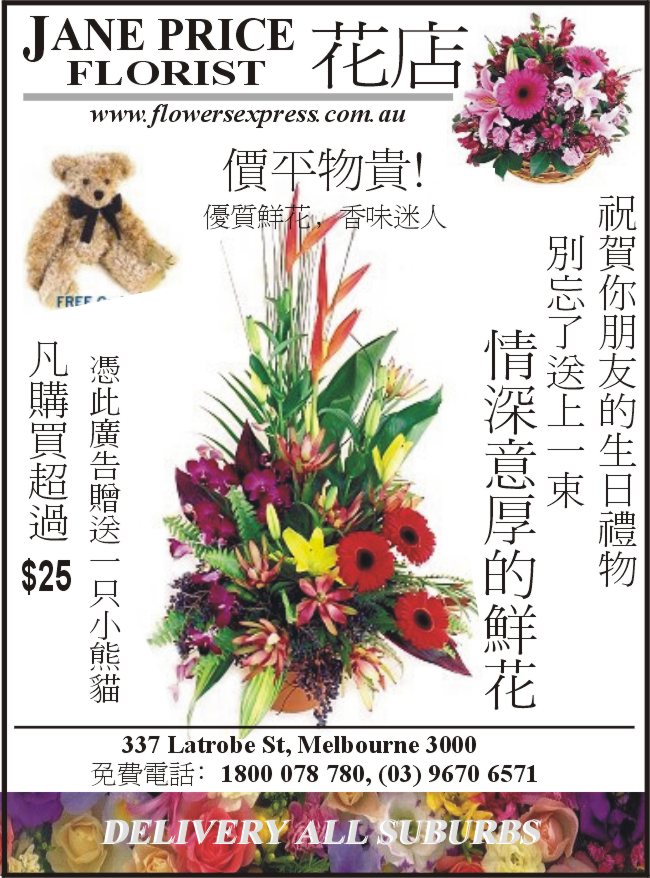 商业目录 Jane Price Florist 英文名称: Jane Price Florist中文名称: 花店业务分类: 鲜花礼品详细介绍: 詳情請見廣告联系电话: 1800 078 780 / 9670 6571商务地址: 337 Latrobe St., Melbourne, VIC Australia 3000 发送消息给业主 商家名称:Jane Price Florist 您的姓名 您的邮件 消息内容