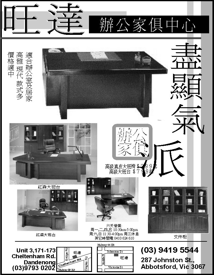 商业目录 Wang Da Furniture 英文名称: Wang Da Furniture中文名称: 旺達家俱中心业务分类: 家具陈设详细介绍: 詳情請見廣告联系电话: (03)9419 5544商务地址: 287 Johnston St, Abbotsford, VIC Australia 3067 发送消息给业主 商家名称:Wang Da Furniture 您的姓名 您的邮件 消息内容
