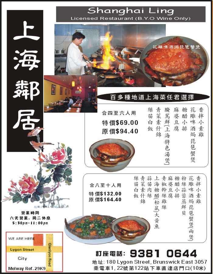 商业目录 Shanghai Ling 英文名称: Shanghai Ling中文名称: 上海人家业务分类: 餐饮娱乐详细介绍: 詳情請見廣告联系电话: (03)9381 0644商务地址: 180 Lygon St,, BruNSW Australia ick East, VIC Australia 3057 发送消息给业主 商家名称:Shanghai Ling 您的姓名 您的邮件 消息内容
