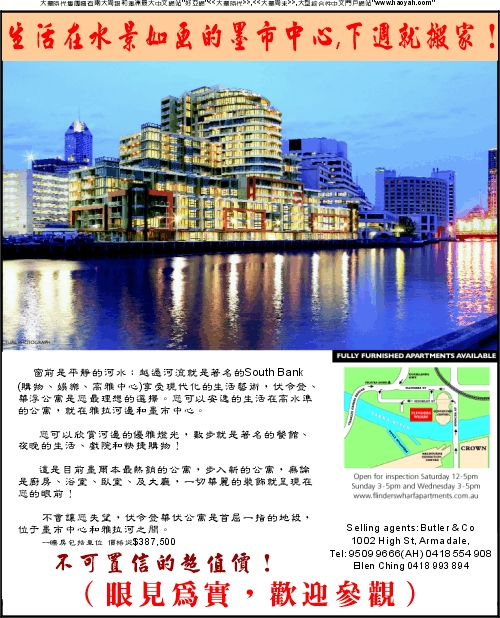 商业目录 Flinderswharf Apartments 英文名称: Flinderswharf Apartments中文名称: 伏令登 華浮公寓业务分类: 房屋地产详细介绍: 詳情請見廣告网站地址: http://www.flinderswharfapartments.com.au联系电话: 9509 9666 (AH) 0418 554 908商务地址: Dockland, VIC Australia 3000 发送消息给业主 商家名称:Flinderswharf Apartments 您的姓名 您的邮件 消息内容