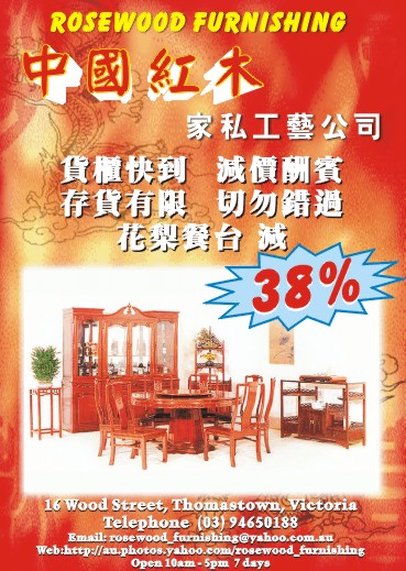 商业目录 Rosewood Furnishing 英文名称: Rosewood Furnishing中文名称: 中國紅木家私工藝公司业务分类: 家具陈设详细介绍: 詳情請見廣告网站地址: http://au.photos.yahoo.com/rosewood_furnishing联系电话: 9465 0188商务地址: 16 Wood Street, Thomastown, VIC Australia 发送消息给业主 商家名称:Rosewood Furnishing 您的姓名 您的邮件 消息内容
