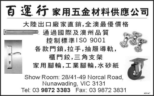 商业目录 BaiYunXing 英文名称: BaiYunXing中文名称: 百運行家用五金材料供應公司业务分类: 家具陈设详细介绍: 詳情請見廣告联系电话: 9872 3383商务传真: 9872 3831商务地址: 28¡þ41¡Ð49 Norcal Road, Nunawading, VIC Australia 3131 发送消息给业主 商家名称:BaiYunXing 您的姓名 您的邮件 消息内容