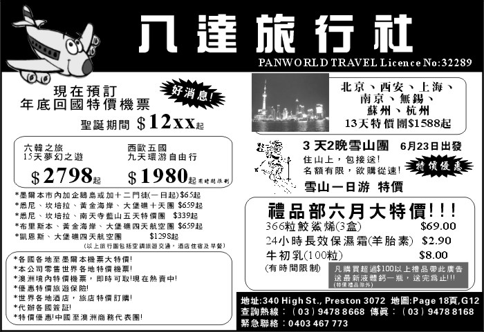 商业目录 Panoworld Travel 英文名称: Panoworld Travel中文名称: 八達旅行社业务分类: 旅游交通详细介绍: 詳情請見廣告联系电话: 9478 8668商务传真: 9478 8168商务地址: 340 High St, Preston, VIC Australia 发送消息给业主 商家名称:Panoworld Travel 您的姓名 您的邮件 消息内容
