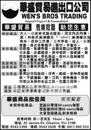 商业目录 WENS BROS TRADING 英文名称: WENS BROS TRADING中文名称: 華盛貿易進出口公司业务分类: 农工商贸详细介绍: 詳情請見廣告联系电话: 9543 5398商务传真: 9543 5028商务地址: 22 James St, Clayton, VIC Australia 3168 发送消息给业主 商家名称:WENS BROS TRADING 您的姓名 您的邮件 消息内容