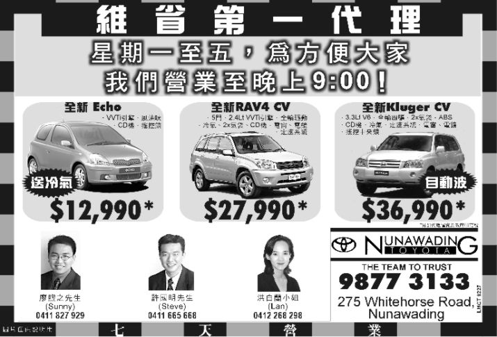 商业目录 Nunawading Toyota 英文名称: Nunawading Toyota业务分类: 机动车行详细介绍: 詳情請見廣告联系电话: 9877 3133商务地址: 275 Whitehorse road, Nunawading, VIC Australia 发送消息给业主 商家名称:Nunawading Toyota 您的姓名 您的邮件 消息内容