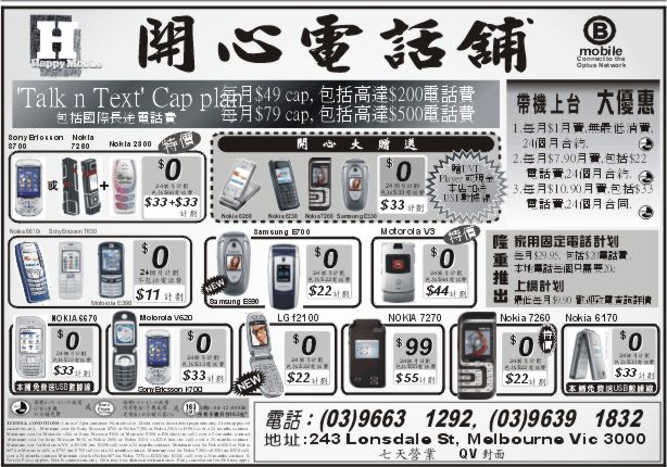 商业目录 Happy Mobile 英文名称: Happy Mobile中文名称: 開心電話舖业务分类: 电脑通讯详细介绍: 詳情請見廣告联系电话: 3 9663 1292, 9639 1832商务地址: 243 Lonsdale St, Melbourne, VIC Australia 3000 发送消息给业主 商家名称:Happy Mobile 您的姓名 您的邮件 消息内容