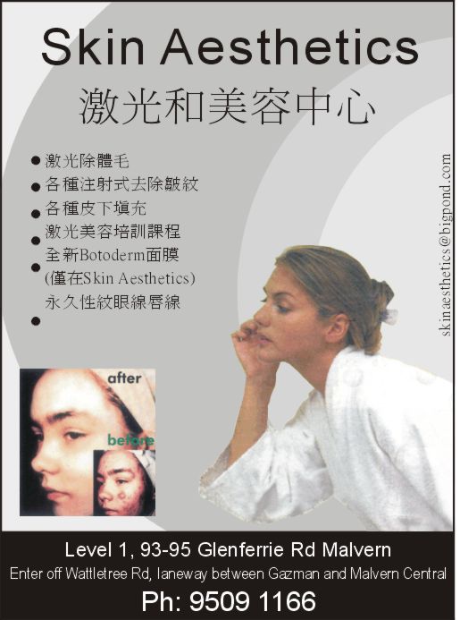 商业目录 Skin Aesthetics 英文名称: Skin Aesthetics中文名称: 激光美容中心业务分类: 美容美发详细介绍: 詳情請見廣告联系电话: 95091166商务地址: level 1,93-95 Glenferrie Rd, Malvern, VIC Australia 发送消息给业主 商家名称:Skin Aesthetics 您的姓名 您的邮件 消息内容