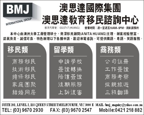 商业目录 BMJ International Group 英文名称: BMJ International Group中文名称: 澳思達國際集團业务分类: 金融保险详细介绍: 詳情請見廣告联系电话: 9670 2930商务传真: 9670 2547商务地址: Suite 201, Level 12 , 118 Queen Street, Melbourne, VIC Australia 3000 发送消息给业主 商家名称:BMJ International Group 您的姓名 您的邮件 消息内容