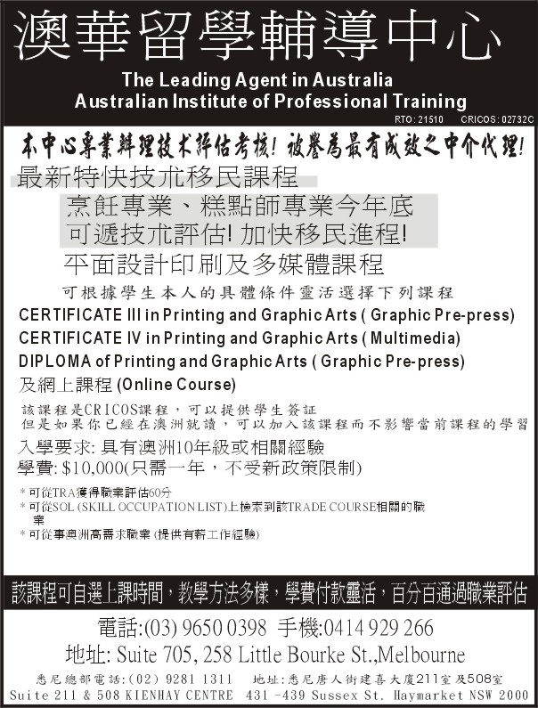 商业目录 Australian Institute of Professional Training 英文名称: Australian Institute of Professional Training中文名称: 澳華留學輔導中心业务分类: 中级教育详细介绍: 詳情請見廣告联系电话: 61 3 9650 0398 or 0414 929 266商务地址: Suite 705, 258 Little Bourke St, Melbourne, VIC Australia 3000 发送消息给业主 商家名称:Australian Institute of Professional Training 您的姓名 您的邮件 消息内容